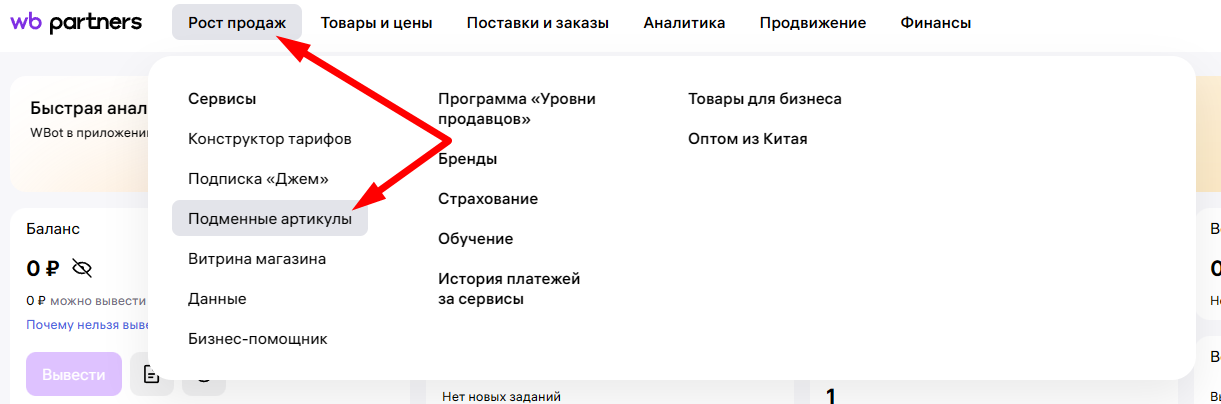 «Рост продаж» → «Подменные артикулы».