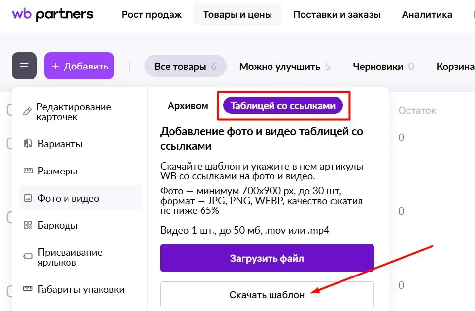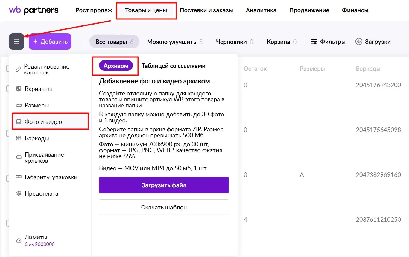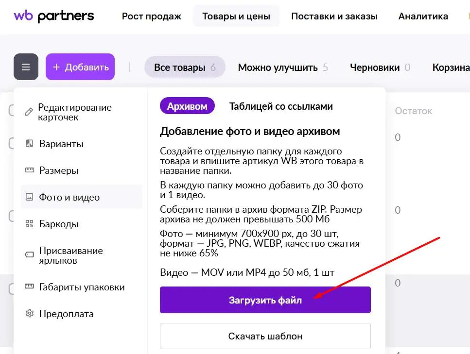 7. Загрузите архив в кабинет WB.