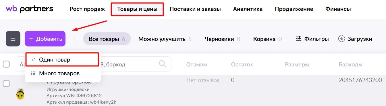 2. Нажмите «Добавить» → «Один товар» → «Создать».