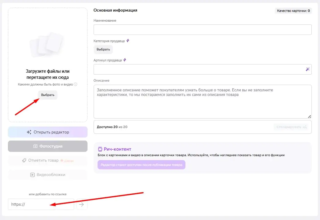 4. Загрузите фотографии и видеофайл — с устройства или по ссылке.
