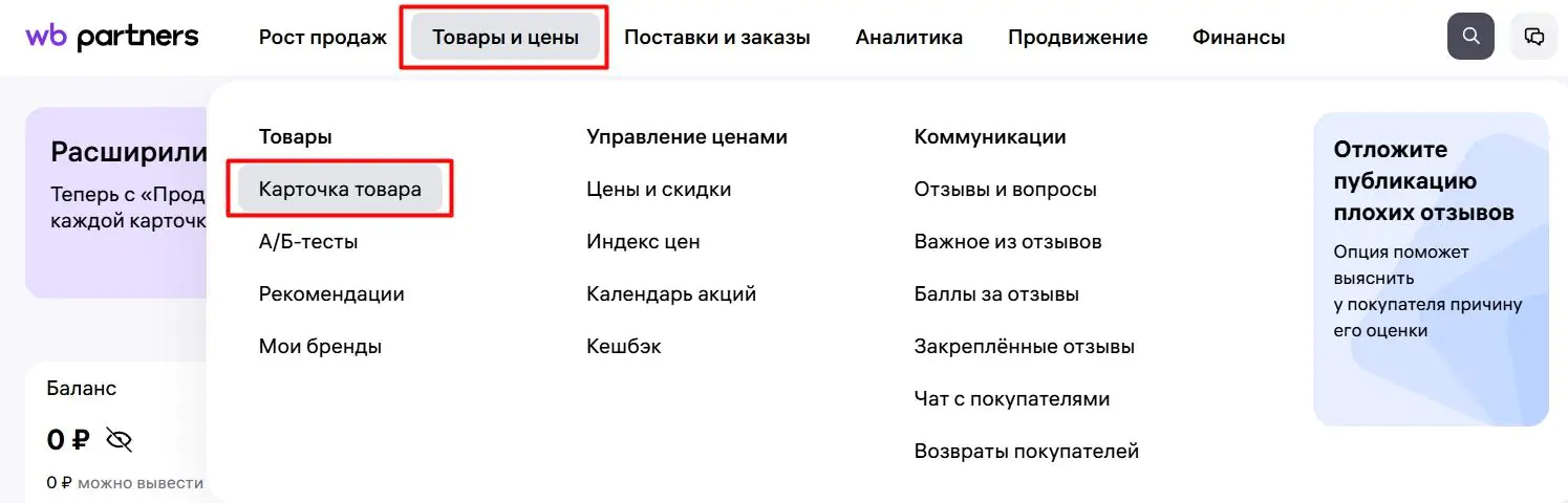 2. Перейдите в раздел «Товары и цены», затем откройте «Карточка товара».