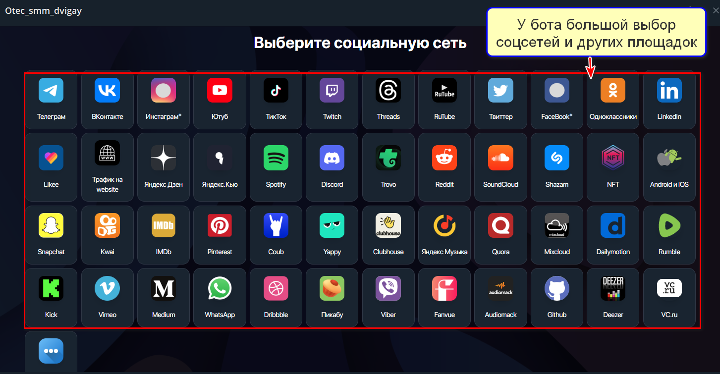 Популярный недорогой бот с пятью десятками соцсетей, для которых доступны услуги продвижения.