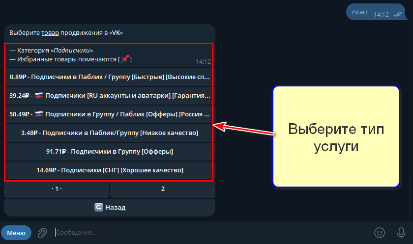 6. Выберите тип услуги: отличия обычно состоят в скорости выполнения заказа, качестве (боты, живые люди), географии, наличии гарантии и т.д.