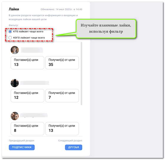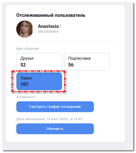 Сервис ВКшпион отличается функциями просмотра суточной активности, взаимной подписки и лайков. В главном меню вам доступен просмотр всех недавно совершенных действий, перечень и статистика по отметкам «Мне нравится». Если вы заинтересованы в том, когда цель была последний раз в сети – воспользуйтесь разделом «Трекер онлайна». Благодаря ему вы сможете отследить, как часто нужный пользователь заходил в ночное время и в какие часы был днем.