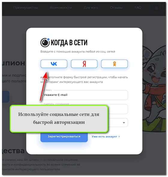 - Зайти на ВКшпион – перейти в раздел «Вход».