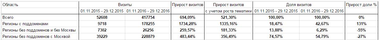 Для анализа мы взяли данные по визитам из поиска (с вычетом бренда) за ноябрь-декабрь 2015-го (поддоменов не было) и ноябрь-декабрь 2016 года (уже с поддоменами).