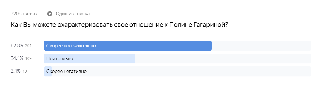 В отличие от предыдущего опроса о знаменитостях, здесь мы не загружали нашу базу контактов, а сразу выбрали из предложенных в сервисе таргетингов, чтобы опросить более широкую аудиторию. Люди активно голосовали за обеих девушек, результаты оказались очень близкими, но победила Полина Гагарина. Вот детали из автоматических отчётов в Яндекс.Взгляде: