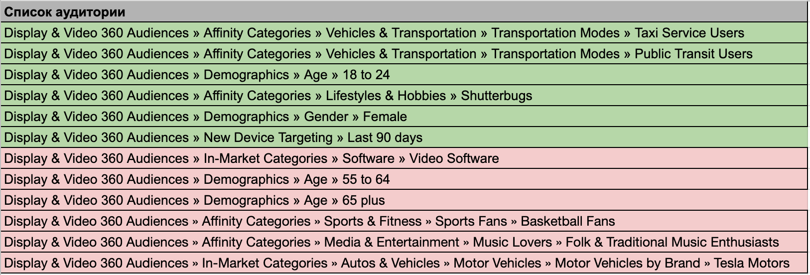 С какими-то таргетингами всё понятно: например, возраст и транспорт. А вот некоторые, в основном красного цвета, показали интересные инсайты: например, видеооператоры, баскетбольные фанаты, любители фолка и Tesla оказались для нас неэффективными. Ну и ладно, как-нибудь и без них справимся :–)