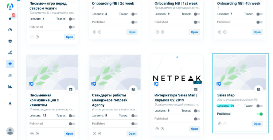 Для обучения новых сотрудников мы используем AcademyOcean. Для программ такого типа главное, чтобы была возможность чётко создать уроки, посмотреть, кто и сколько времени потратил, результаты квизов.