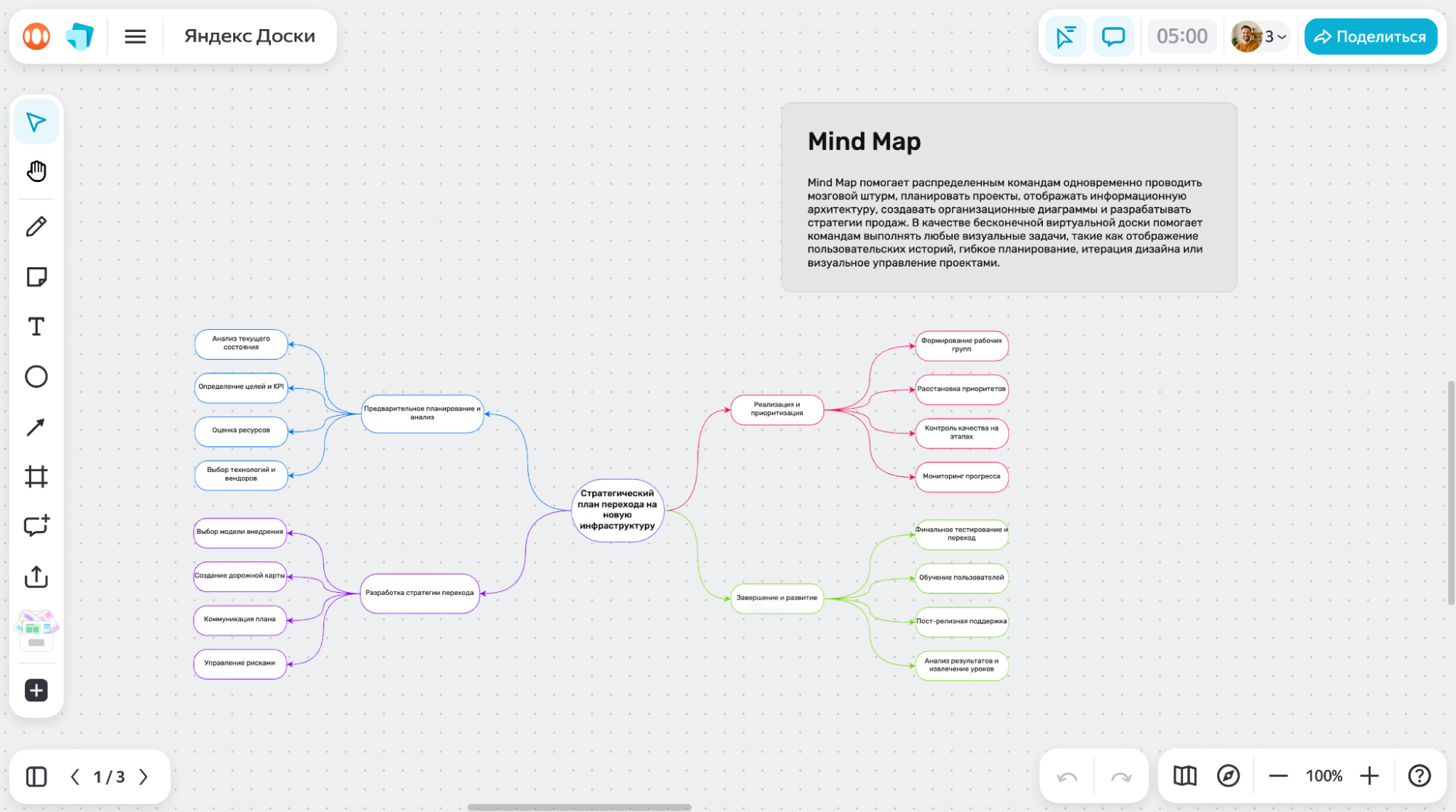 Переход на новую инфраструктуру должен быть не спонтанной инициативой, а частью стратегического плана. Важно определить цели и конкретные результаты, которых компания ожидает. Для этого можно использовать mindmap в Досках, чтобы сформировать общее представление о переходе и обозначить приоритеты на ближайшие месяцы.