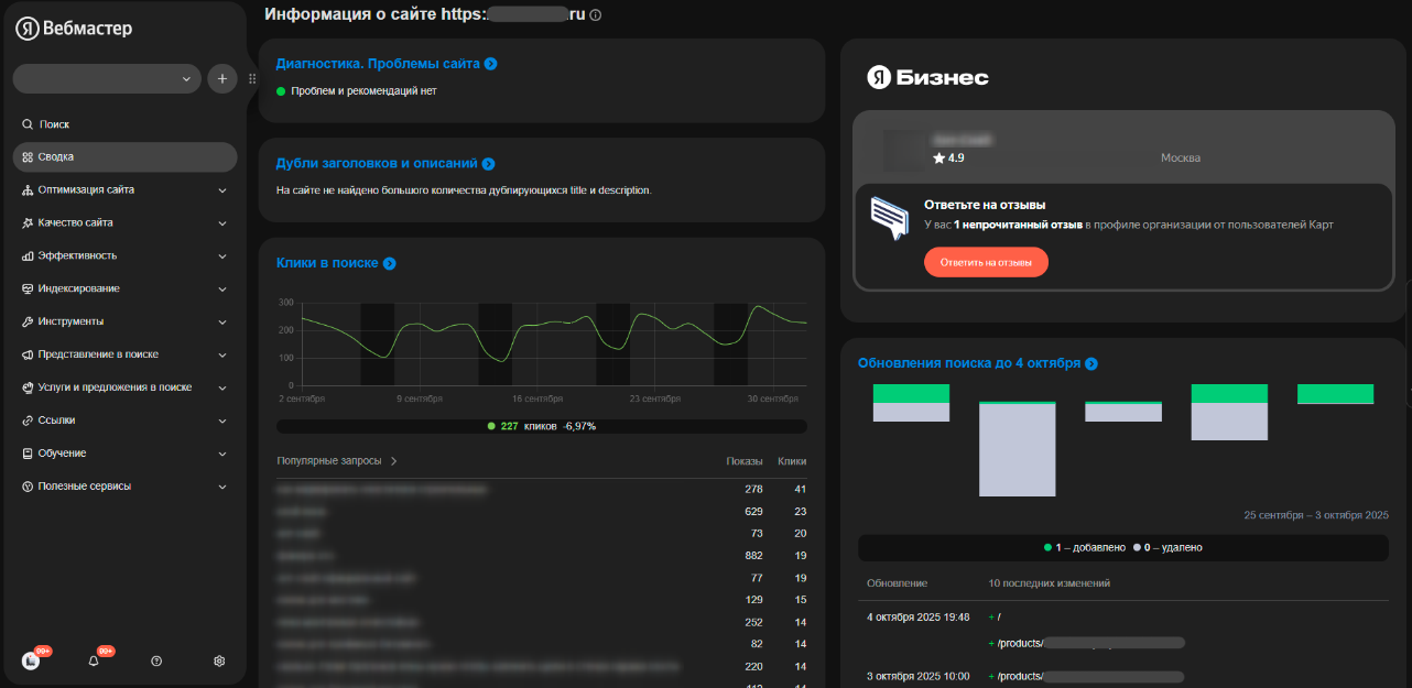 На базовом уровне используются счетчики и панели: Яндекс Вебмастер, Яндекс Метрика, Google Search Console. Они позволяют отслеживать трафик, позиции, технические параметры сайта.