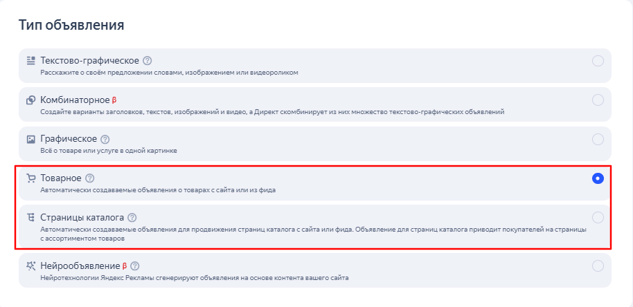Их не нужно формировать вручную. Потребуется только указать сайт с настроенной строгой микроразметкой для товаров и каталогов либо загрузить товарный фид в кампанию. Во втором случае Директ автоматически сгенерирует объявления под каждую позицию.
