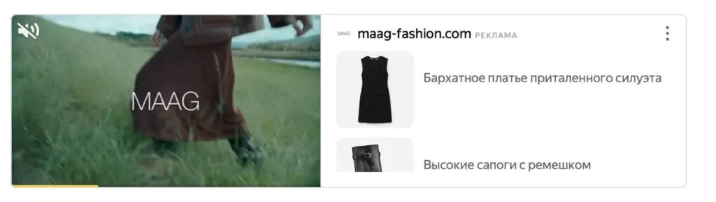Баннер интерактивный: пользователь может листать карточки нескольких товаров и сразу знакомиться с ассортиментом магазина. Это помогает показать больше предложений и повысить вовлеченность. Есть и ограничение: управлять форматом и настраивать вручную нельзя. Рекламодатель только создает разные типы объявлений в одной группе, а система сама решает, собрать ли из них единый блок.