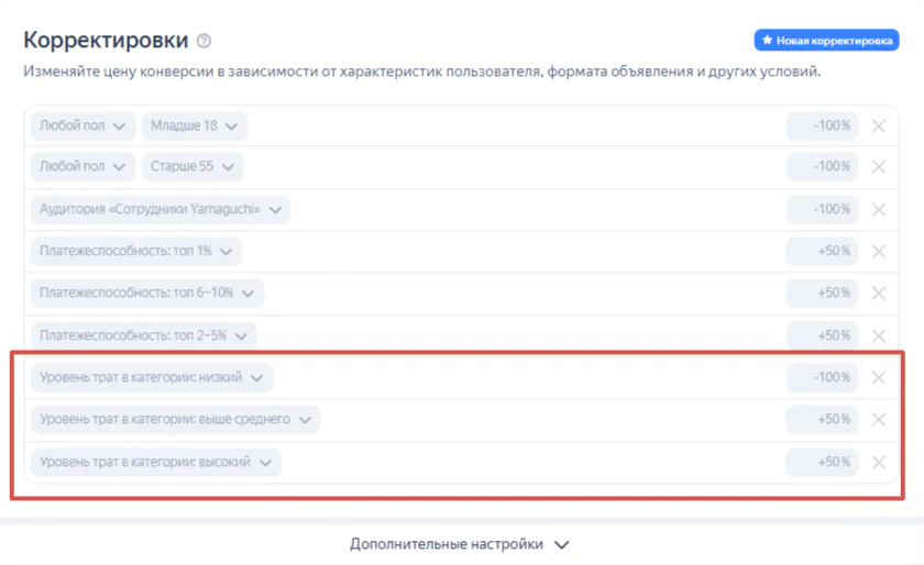 Точные диапазоны трат не задаются вручную — Директ сам относит пользователей к соответствующим категориям на основе их поведения.