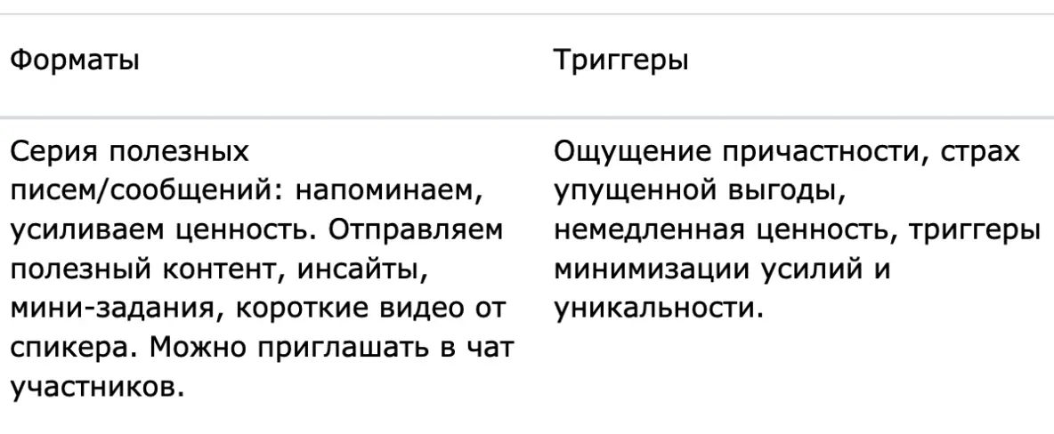 3. Обеспечение участия (1-2 дня до события и в день события). Задача — свести на минимум препятствия для прихода на мероприятие. Используются напоминания по почте, через Telegram со ссылками и четкими инструкциями. В коммуникации усиливается фактор срочности. Рекламные кампании корректируются под триггер «Скоро старт».