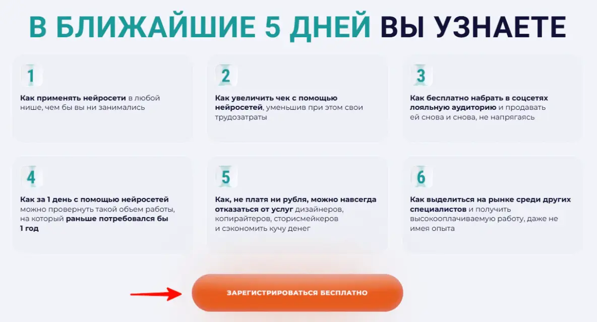 4. Призыв к действию и форма регистрации. Чем проще, тем лучше: обычно хватает 2-3 полей (имя, электронная почта / телефон). Длинные анкеты снижают количество регистраций. Кнопка должна быть заметной и конкретной: «Зарегистрироваться бесплатно», «Хочу на вебинар», «Получить доступ». CTA лучше повторять после ключевых блоков.