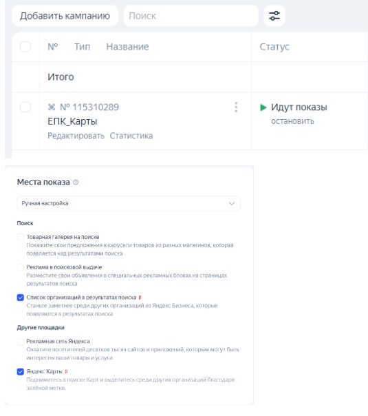 В режиме эксперта (ЕПК) откройте «Добавить кампанию» и выберите продвижение на Картах или в списке организаций. Можно подключить обе площадки одновременно, чтобы охватить максимум локальной аудитории.