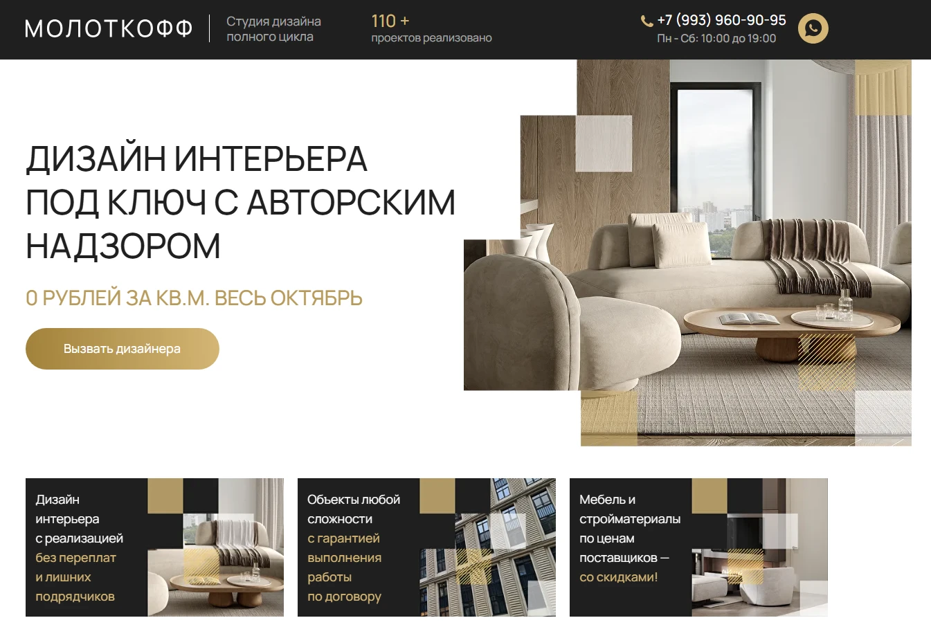 Одностраничные сайты и лендинги лучше всего работают под конкретные услуги. Например, «ремонт квартиры под ключ» или «монтаж пластиковых окон». Их цель — быстро привести пользователя к заявке. Для этого используются точные коммерческие запросы, простая и логичная структура и заметные призывы к действию.