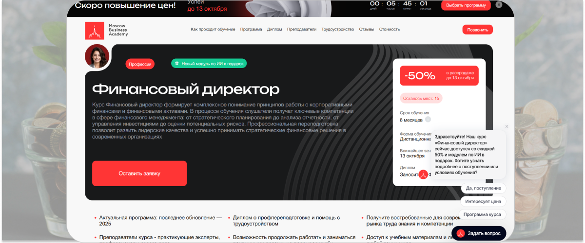 - «Финансовый директор» от Moscow Business Academy: курс ведут практикующие эксперты, а после обучения помогают в трудоустройстве.
