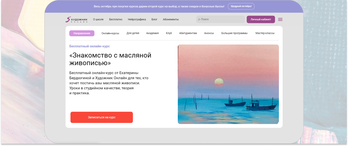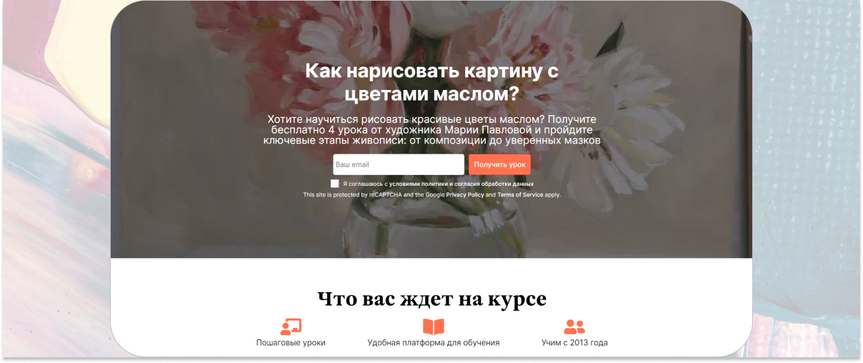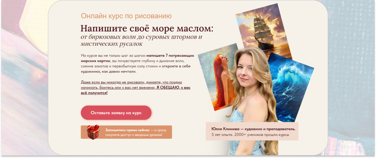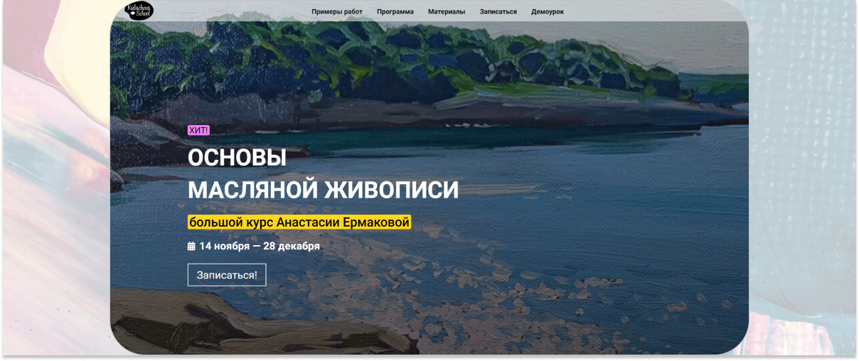 Уроки сопровождаются советами профессионального художника, а всё обучение — поддержкой куратора. После записи на курс участникам отправляют список нужных материалов для покупки. Также можно оставить заявку и получить бесплатный доступ к первым двум урокам.