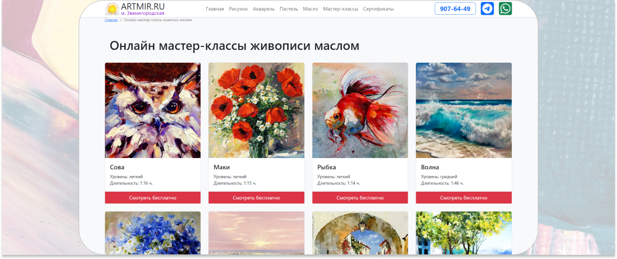 3. «Онлайн мастер-классы живописи маслом» от студии «АртМир»: бесплатная подборка из пяти пошаговых уроков, каждый из которых посвящён отдельной картине и снабжён списком необходимых материалов.