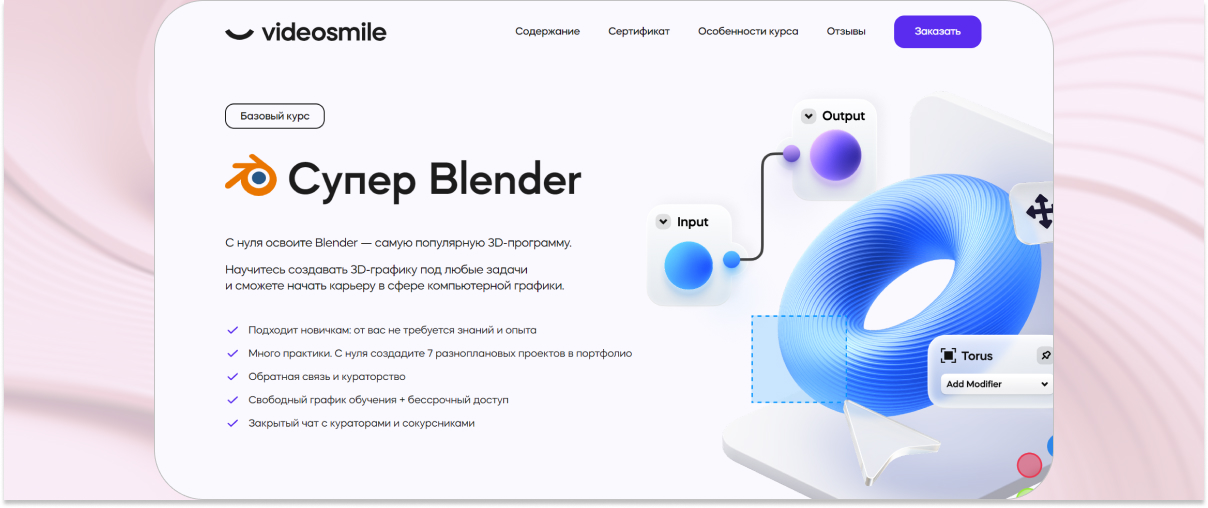 - «Супер Blender» от VideoSmile: курс для начинающих, который помогает освоить 3D-моделирование и научиться создавать объекты, сцены и анимацию в Blender.