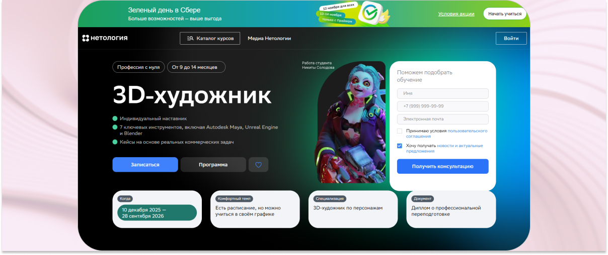 - «3D‑художник» от «Нетологии»: программа профессиональной подготовки по 3D-графике с наставничеством, проектами для портфолио и карьерной поддержкой.