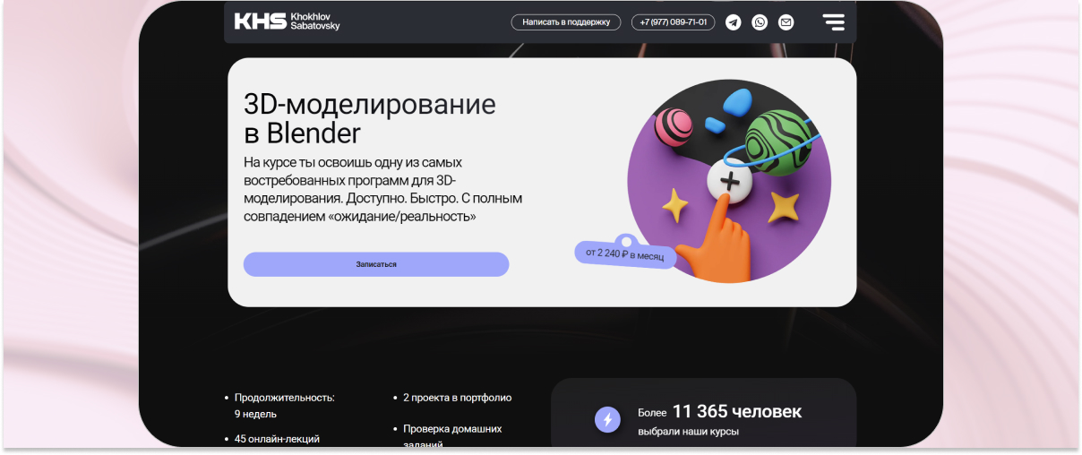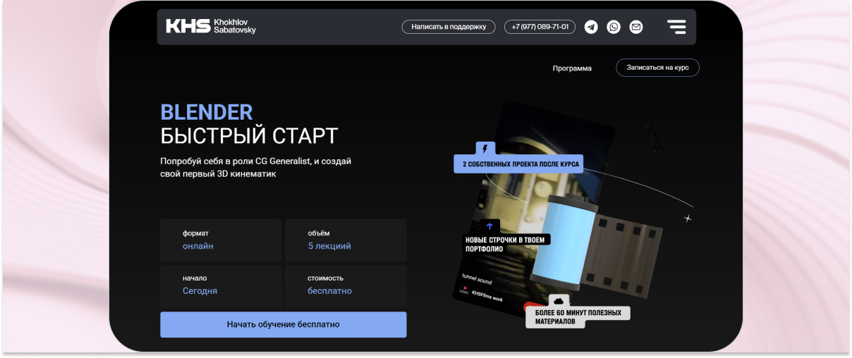 - «3D-моделирование в Blender» от «Хохлов Сабатовский»: курс с практическими заданиями, прямыми эфирами и возможностью участвовать в проектах «Агентства креативных талантов».