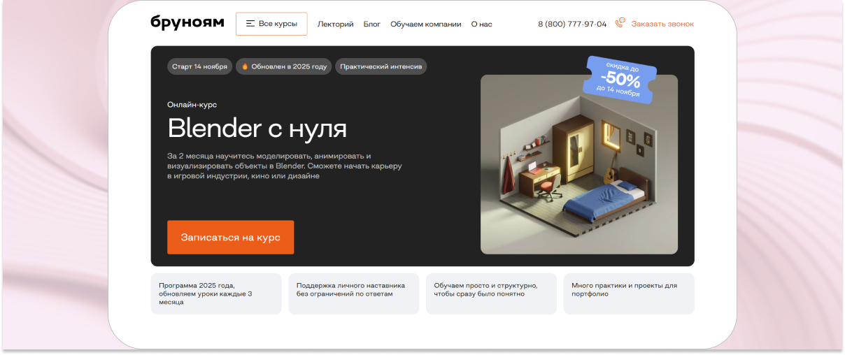 - «Blender с нуля» от «Бруноям»: курс с поддержкой личного наставника и доступом к мини-курсу по трудоустройству.