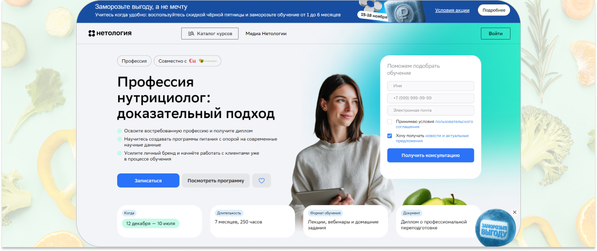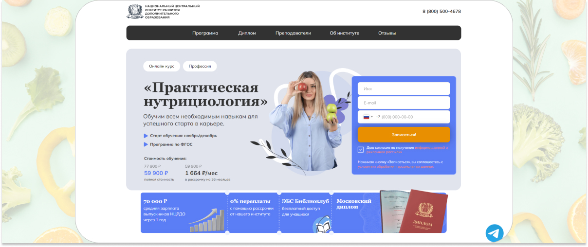 9. «Практическая нутрициология» от НЦРДО: курс от преподавателей-практиков с опытом более 30 лет с бонусом в виде консультации HR.