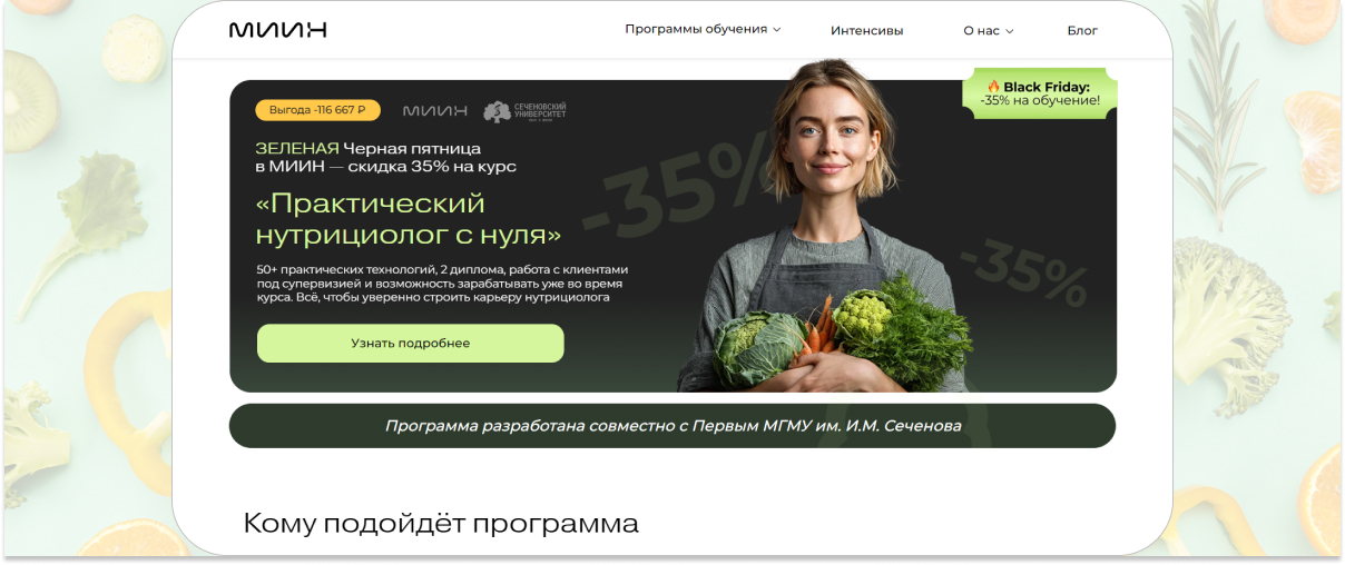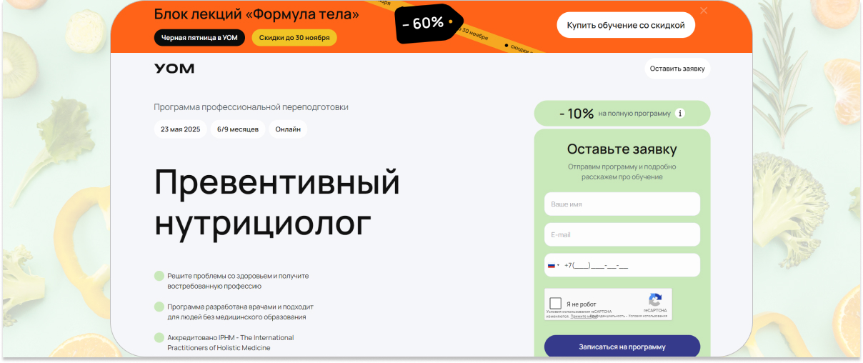 5. «Превентивный нутрициолог» от УОМ: программа с акцентом на работу с анализами, коррекцию образа жизни и сопровождение клиентских кейсов.