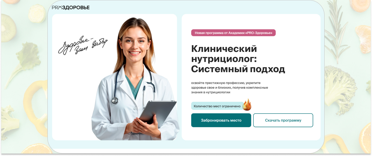8. «Клинический нутрициолог» от «PRO-Здоровье»: курс с возможностью вести клиента с первого дня обучения под присмотром тьютора-нутрициолога.