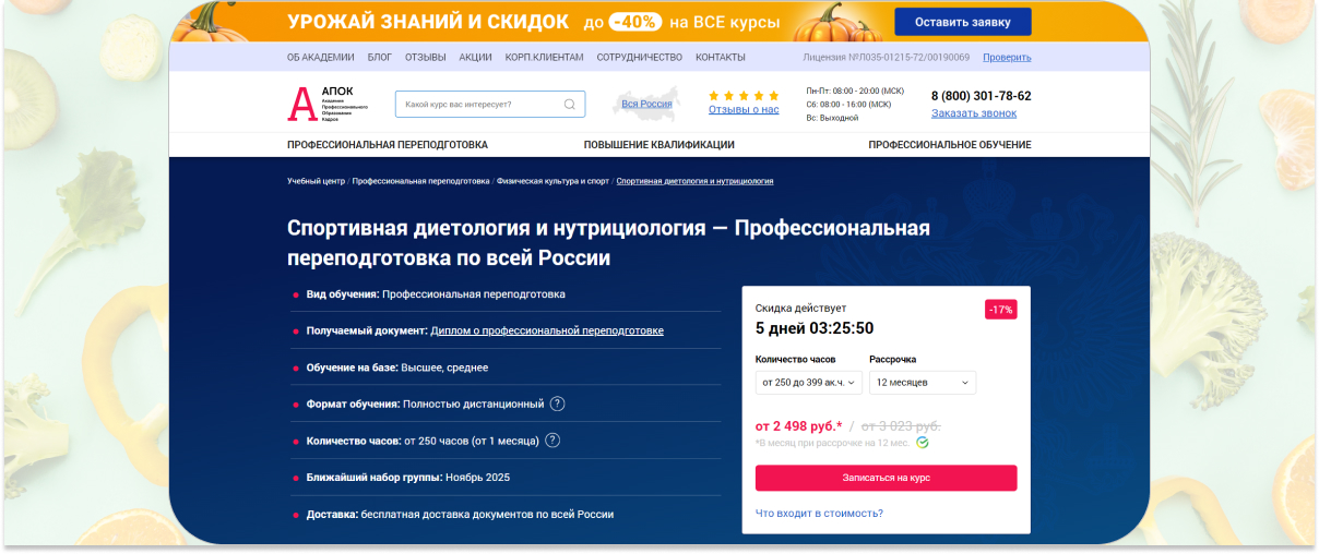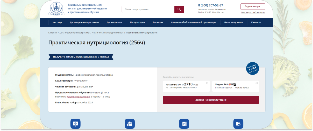 Студенты изучают методы анализа пищевого поведения, учатся корректировать рацион, разбираться в БАДах и адаптировать рекомендации под разные запросы. На платформе есть поддержка кураторов, методические материалы, а также доступ к урокам по взаимодействию с клиентом и оформлению консультаций. После завершения обучения выдаётся диплом установленного образца.