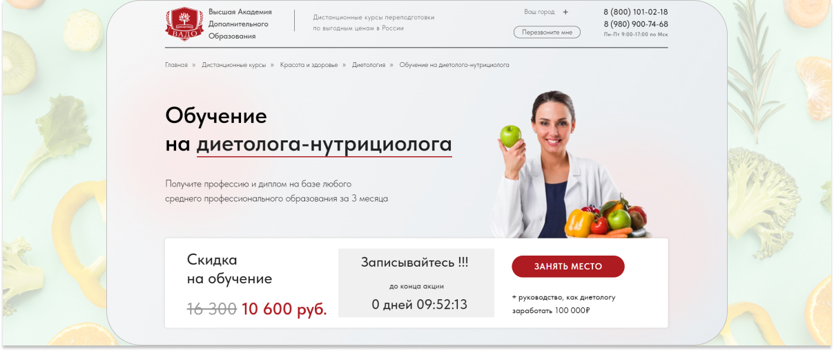 3. «Диетолог-нутрициолог» от ВАДО: ускоренный трёхмесячный курс с узкоспециализированными дисциплинами: детская и спортивная нутрициология, расшифровка анализов.