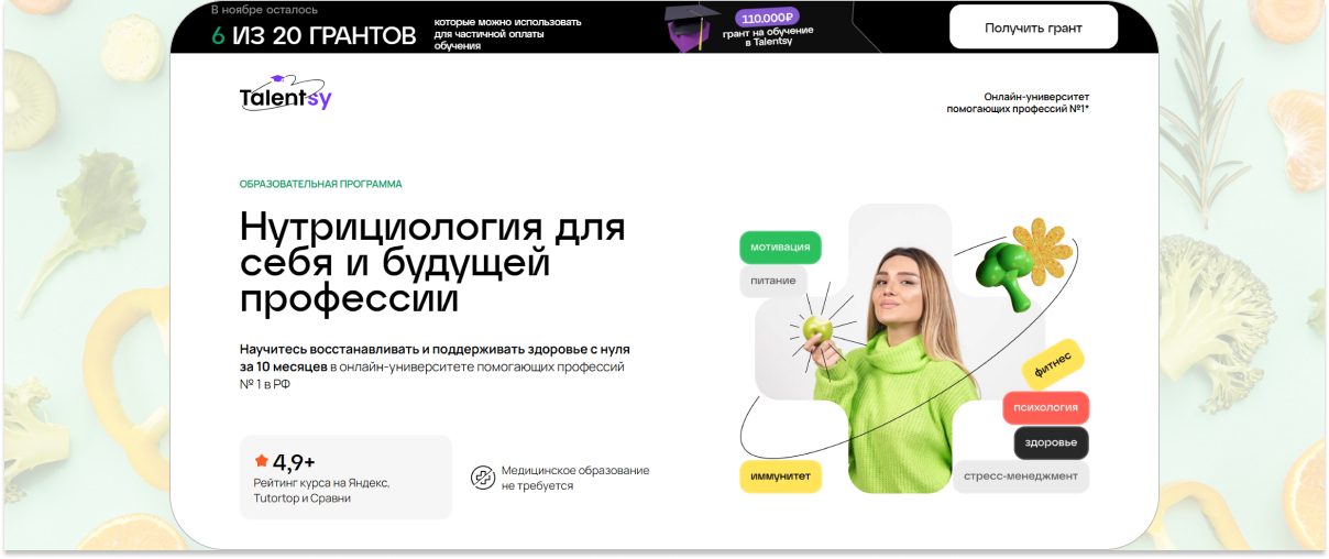 4. «Нутрициология для себя и будущей профессии» от Talentsy: курс, на котором выдают два международных сертификата с правом консультирования в сфере нутрициологии.