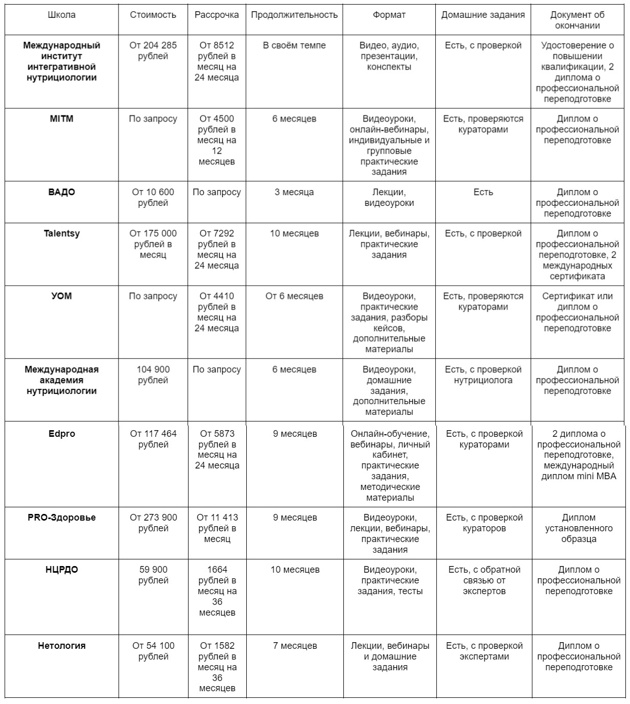 1. «Практический нутрициолог с нуля» от «Международный институт интегративной нутрициологии»: практика с реальными клиентами под супервизией преподавателей с обратной связью после каждого модуля.