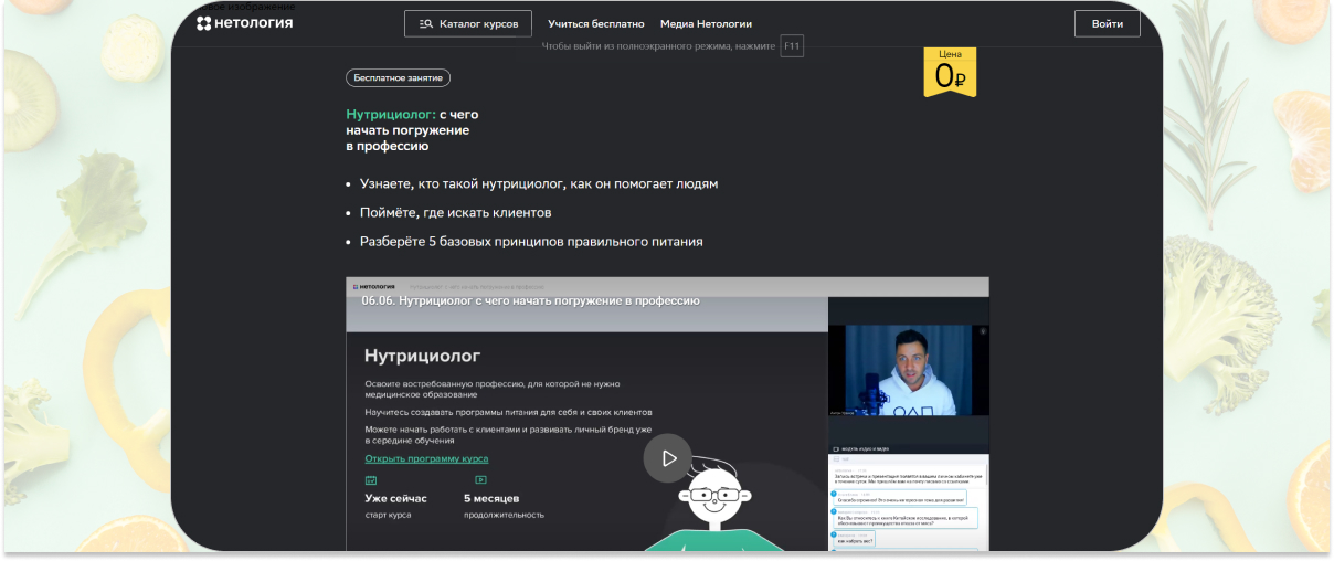 10. «Профессия нутрициолог: доказательный подход» от «Нетологии»: практический курс, в числе преподавателей которого — выпускник факультета биотехнологий ИТМО, эксперт и редактор издания «Купрум», эксперт сети магазинов «Глобус».
