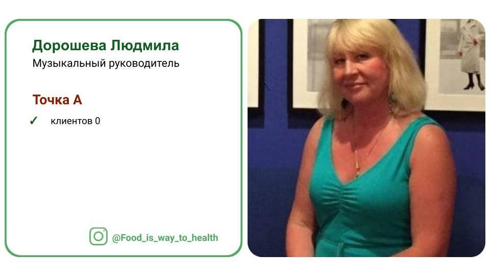 Людмила, выпускница «Международной академии нутрициологии». Оздоровила своё состояние, снизила вес на 10 кг и начала работать с первыми клиентами — появилось три запроса на сопровождение и консультации. Наладила режим питания и сна, выстроила интервалы между приёмами пищи.