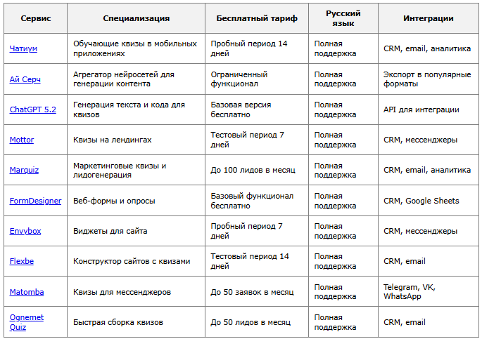 Сравнительная таблица лучших нейросетевых конструкторов квизов