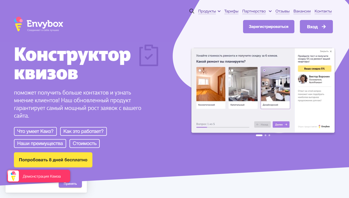 - Envybox: набор виджетов для сайта, включающий мультиквизы для захвата внимания посетителей.