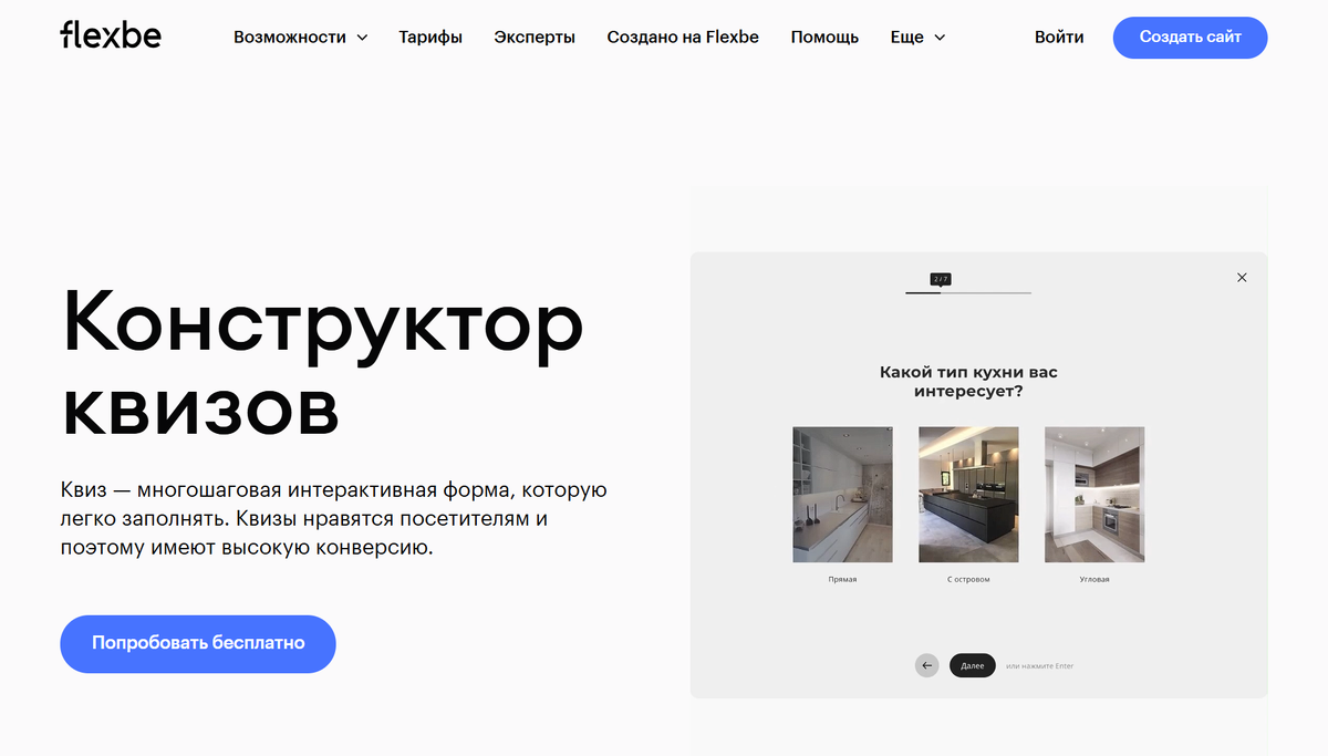 - Flexbe: платформа для создания сайтов с готовыми шаблонами интерактивных квизов.