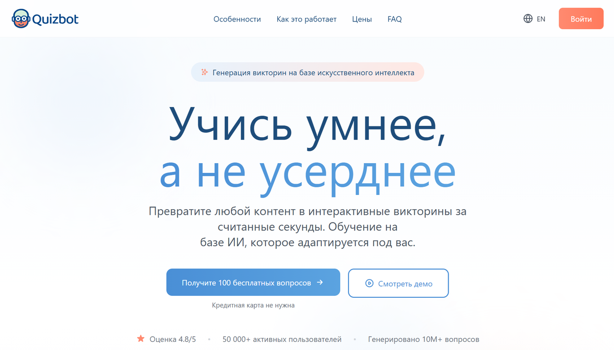 - Генерация полной структуры квиза за 2–3 минуты.