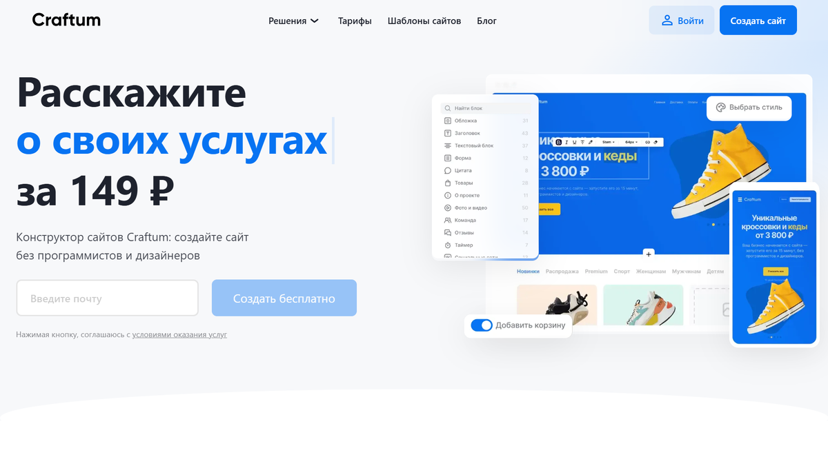 1. Регистрация и выбор типа сайта. Необходимо создать аккаунт и указать цель проекта: интернет-магазин, лендинг, портфолио или блог.