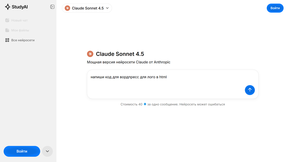 ChatGPT 5.2 — языковая модель от OpenAI, доступная через платформу Study AI без VPN и зарубежных карт. Нейросеть генерирует структуру веб-страниц, пишет HTML-код с разметкой, создаёт CSS-стили для оформления и формирует тексты для всех разделов сайта. Пользователь задаёт описание проекта в диалоговом окне, модель предлагает готовую разметку с комментариями для каждого блока и рекомендациями по дальнейшей доработке.