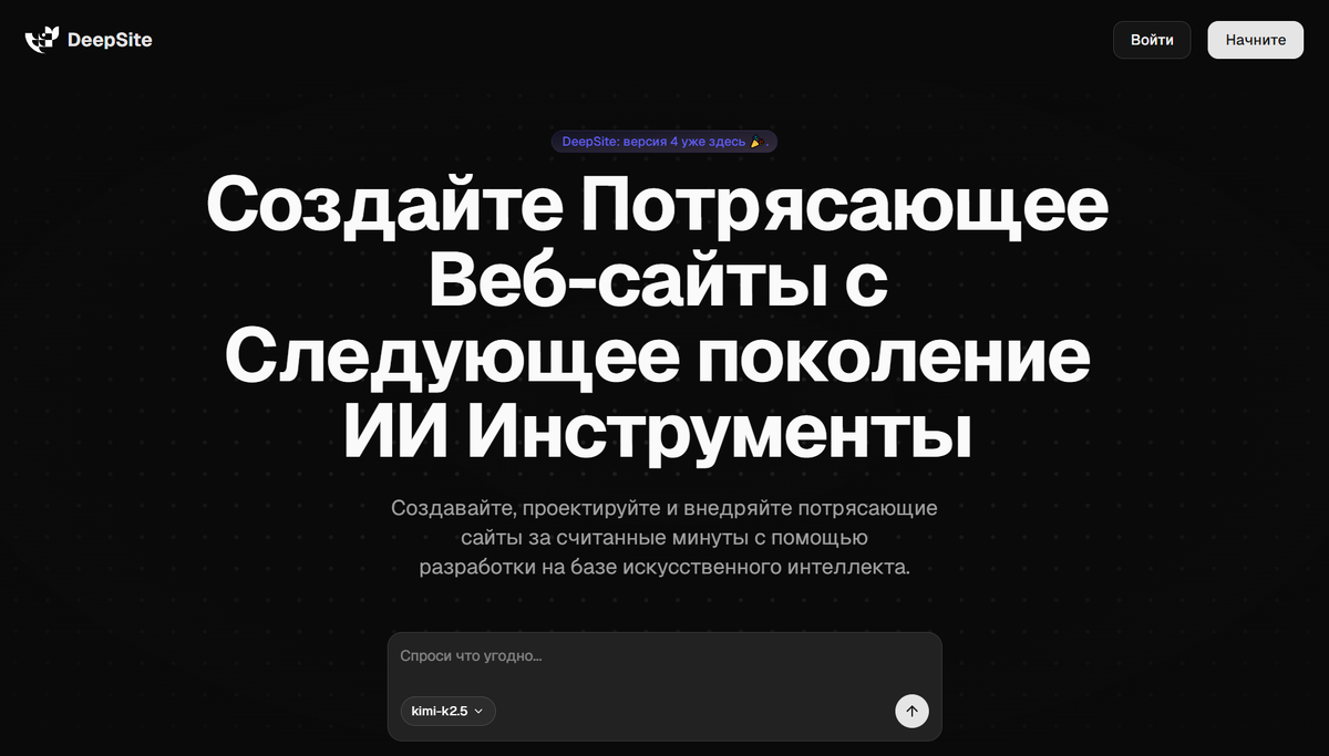 • Быстрая генерация готового сайта по описанию задачи.