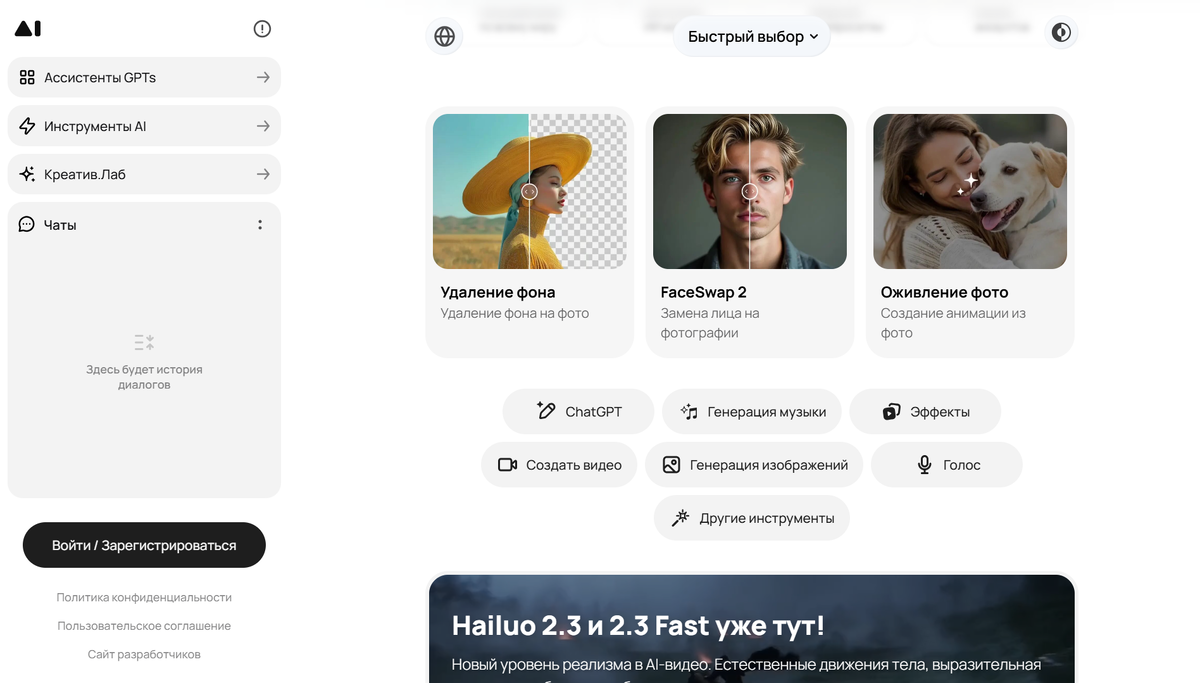 Тип сервиса: агрегатор нейросетей с генерацией сайтов.