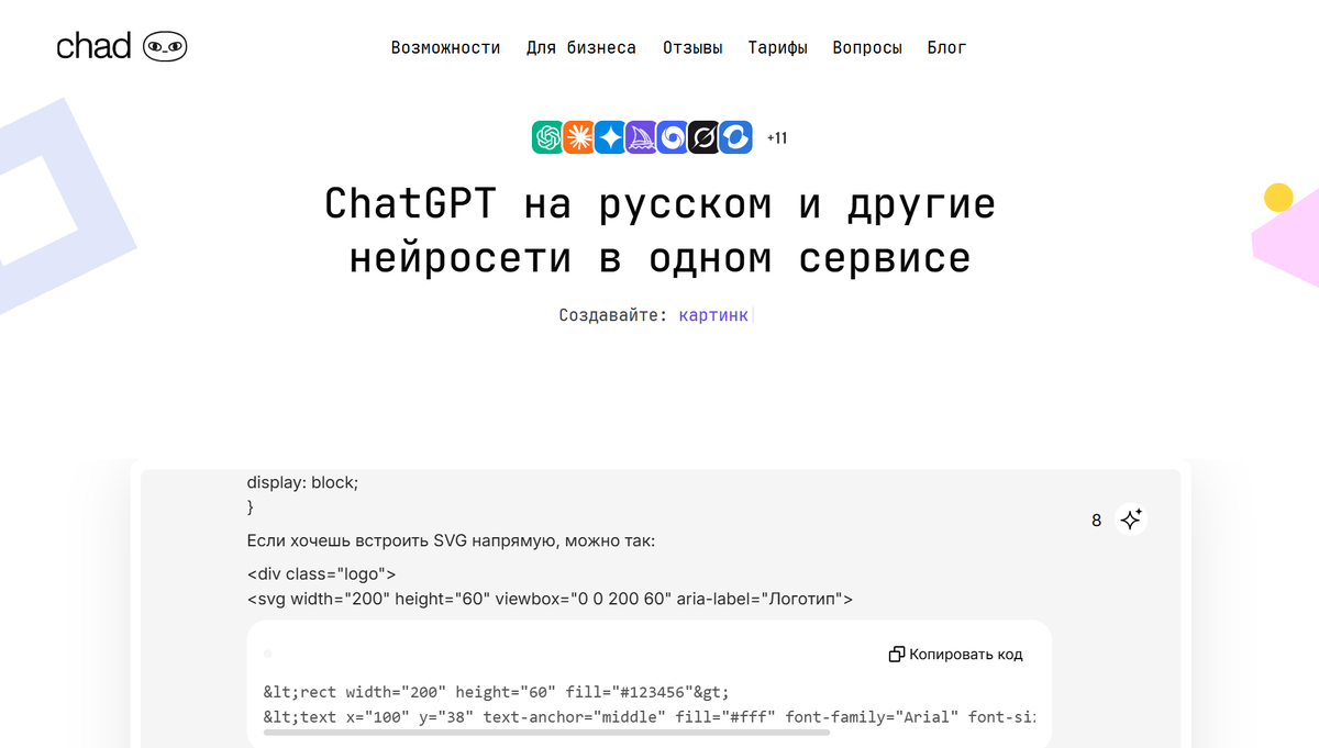 2. Chad AI — сервис с упором на качественную генерацию текстового наполнения и структуры будущих веб-страниц на русском языке.