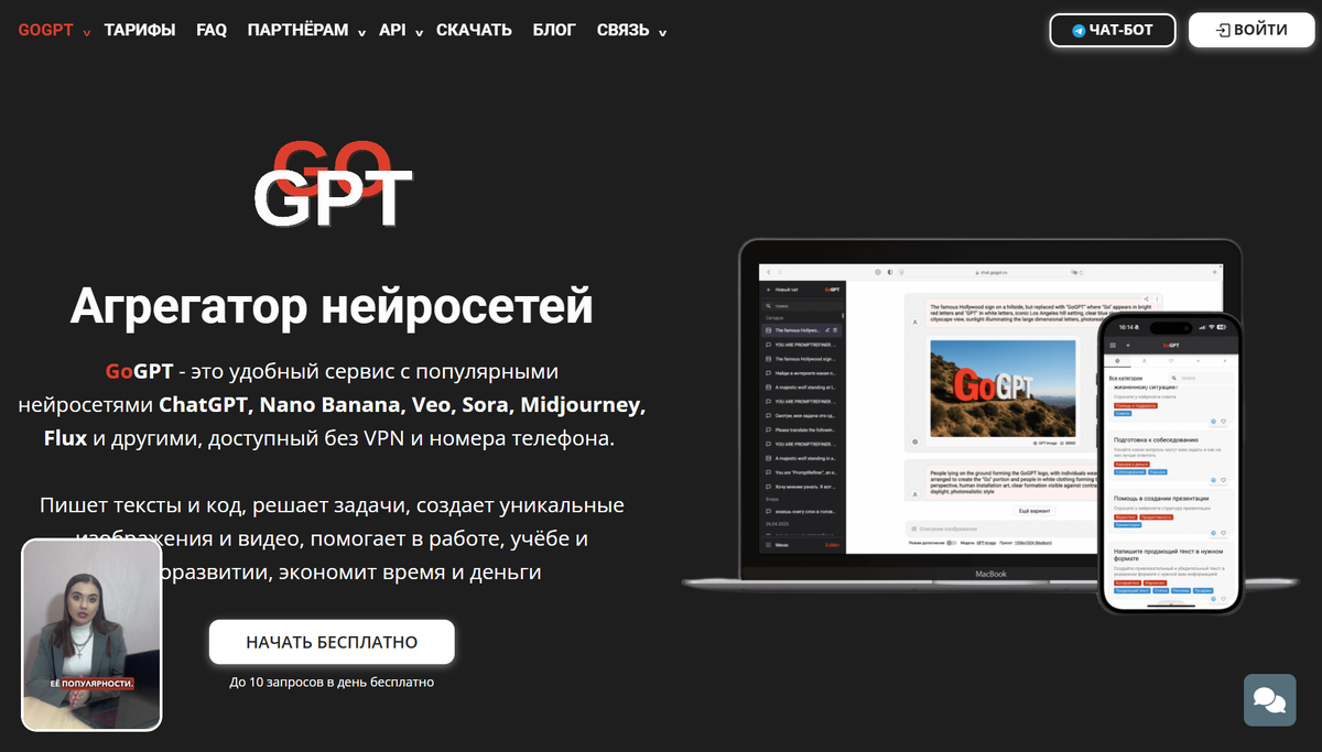 GPTunnel — российский сервис для доступа к языковым моделям OpenAI и Anthropic с функцией генерации веб-страниц. Платформа работает как прокси-сервис, обеспечивая стабильное подключение к GPT-4, GPT-4 Turbo и Claude 3.5 без использования VPN. Пользователь формулирует задачу в текстовом поле, нейросеть создаёт HTML-разметку, CSS-стили и JavaScript-скрипты для интерактивных элементов, предлагая готовый код для копирования и размещения на хостинге.