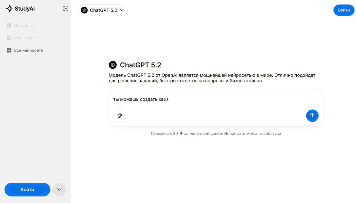 Доступ к ChatGPT 5.2 оплачивается токенами Study AI: каждый запрос списывает от 5 до 50 токенов в зависимости от объёма генерируемого контента. При регистрации начисляется 40 приветственных токенов для тестирования. Платформа предлагает три тарифа — Start с 400 токенами в неделю, PRO с 1 800 токенов в месяц, ULTIMA с 5 000 токенов и приоритетной обработкой запросов. Оплата принимается через СБП, SberPay, T-Pay и карты российских банков.