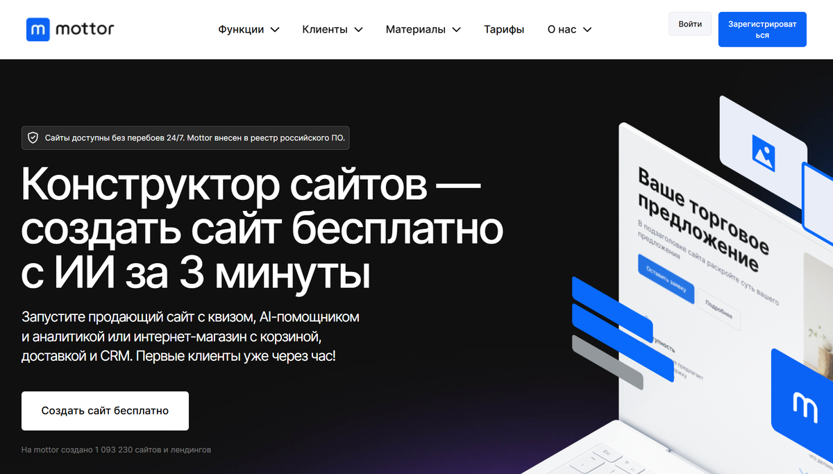 8. Mottor — конструктор с ИИ-помощником для автоматического создания продающих лендингов и автоворонок.